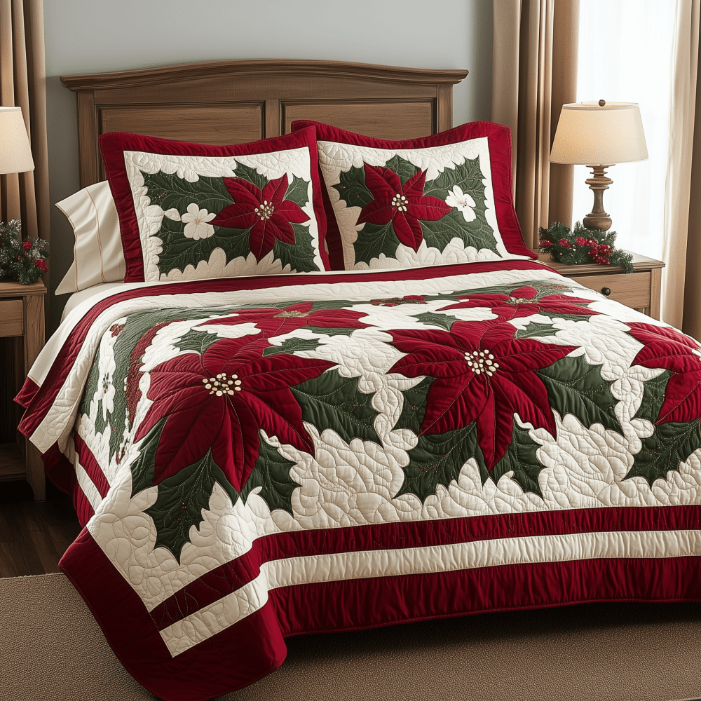 Festive Poinsettia Quilted Bedding Set Christmas Gifts For Siblings - Bancroftclothings