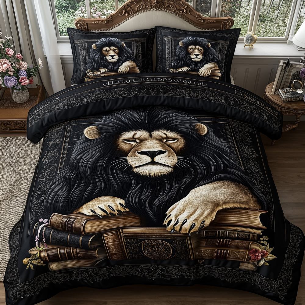 Lions Library Quilted Bedding Set Classic Lion Decor Best Wildlife Design Gifts.