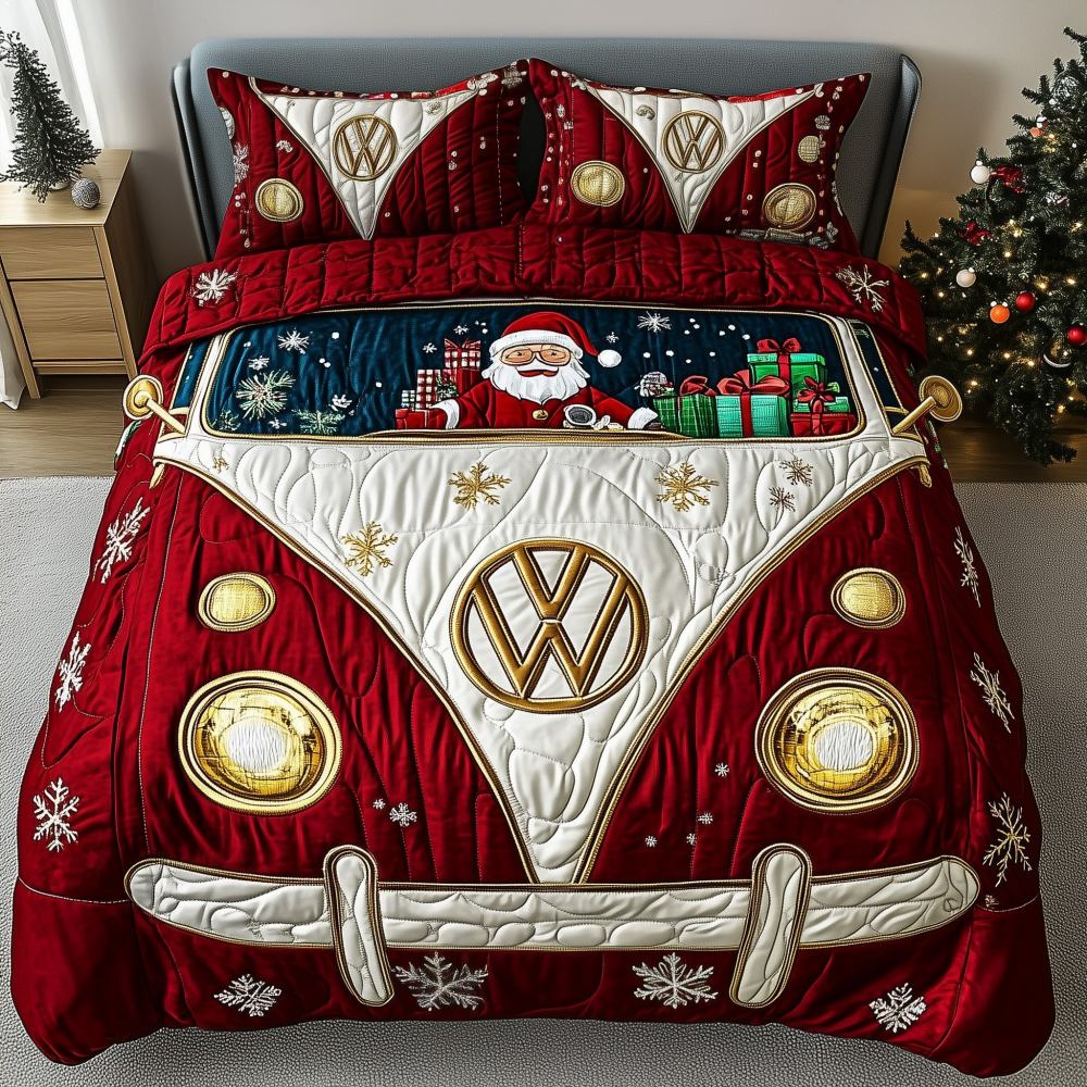 Santa Holiday Camper Quilted Bedding Set Retro Christmas Van Design Happy Christmas Day Gifts - Bancroftclothings